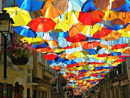 Szentendre Belvárosa, a butiksor, az ernyők vidám dekorációt és árnyékoló hatást egyaránt biztosítanak