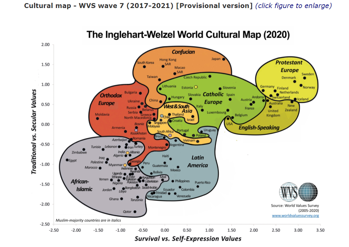 Külön érdekesség, hogy a magyar-litván-portugál nemzetek (továbbiakban: "A"-csoport) az Inglehart –Weizel féle koordináta "érték"-rendszerben egészen közel állnak egymáshoz és a Dél-Kelet Ázsiai országokhoz is! de konzekvensen távolabb a "protenstáns Európa" képviselőitől (továbbiakban: B-csoport)!